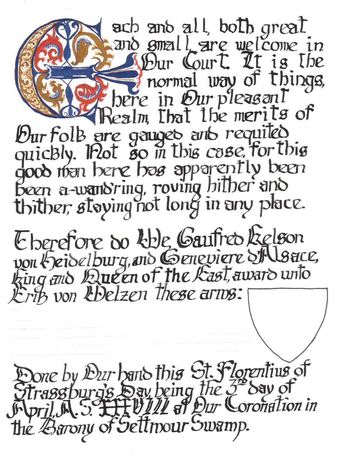 | This East Kingdom scroll was awarded 4/3/04. The scroll is a "collaboration" effort. The illumination was done by Lady Ding Li Ying and Merewyn Atte Greenwode based on a 12th Century Book of the Cistern Abby. The scroll blank was given to Mistress Michel for later use. I was given the blank with some words done by Lord Rhodri Ewias and assigned the task of being a "field scribe" (scribing on the fly) during a "lesson" at Michel's. I looked in the calligraphy books for a hand that would match the scroll and my limited calligraphy skills and choose Rotunda. After practicing the alphabet once, I went to work and this is the result. The calligraphy was done using a dip pen and Higgins Eternal Ink. Next time I do this, I will grid the entire page instead of trying to match once I got used to the grid. |
