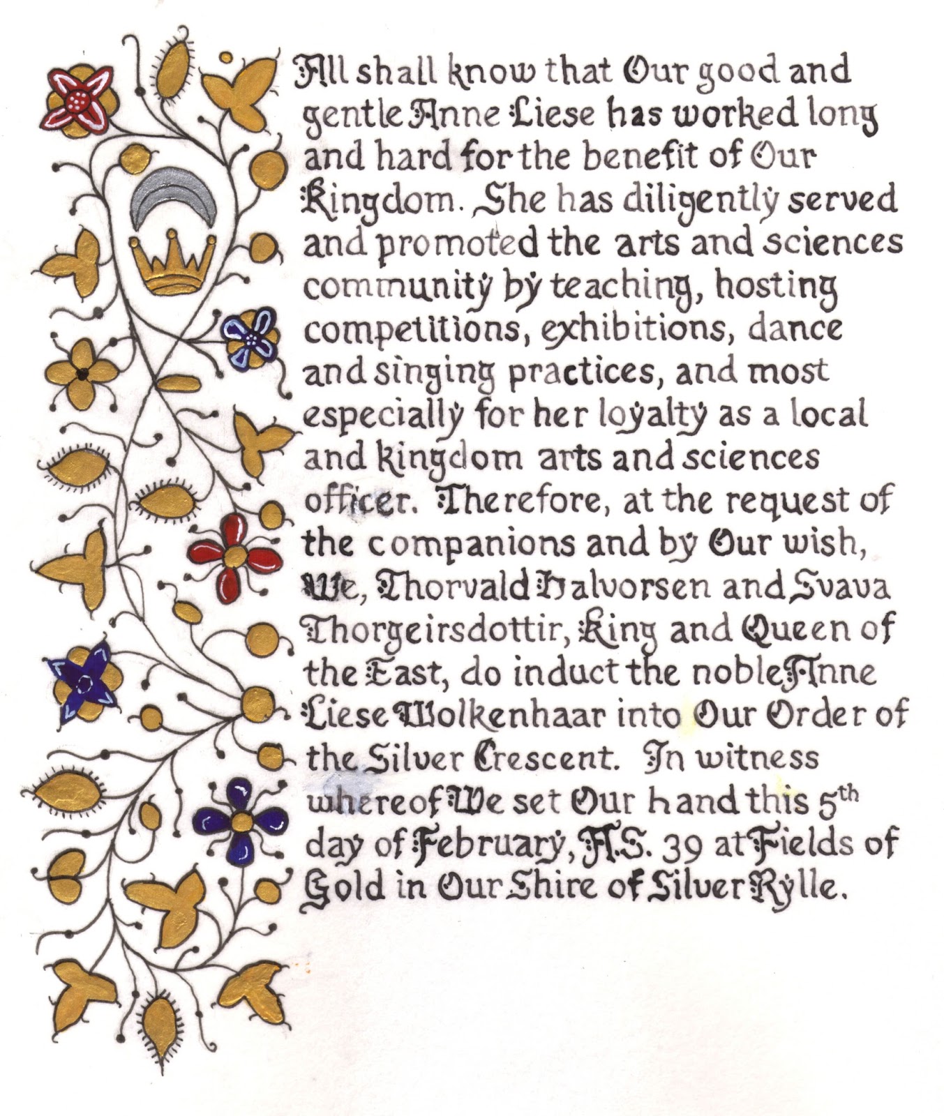 | This scroll was awarded on 2/5/05 at Fields of Gold. The scroll is based on a manuscript leaf from a choir book with early 14th Century French Illumination. I did the calligraphy first, covered it to protect it, painted and then found out that there was a water drop and 2 spots of paint that had gotten on the calligraphy |